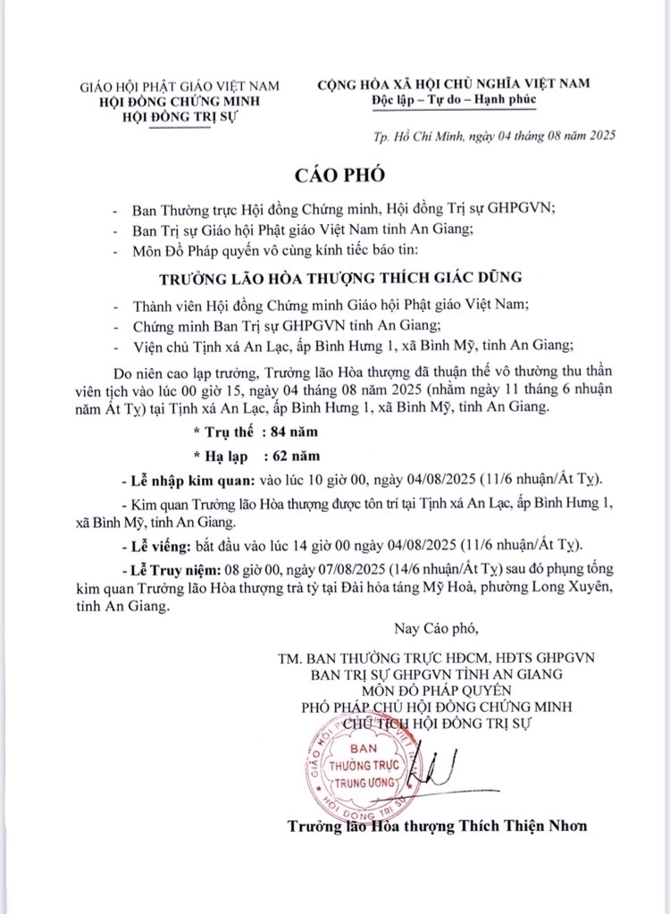 Trưởng lão Hòa thượng Giác Dũng - Thành viên Hội đồng Chứng minh GHPGVN, Chứng minh Ban Trị sự GHPGVN tỉnh An Giang, Viện chủ Tịnh xá An Lạc (ấp Bình Hưng 1, xã Bình Mỹ, tỉnh An Giang) vừa viên tịch hôm nay, 4/8/2025 (11/6N/Ất Tỵ).