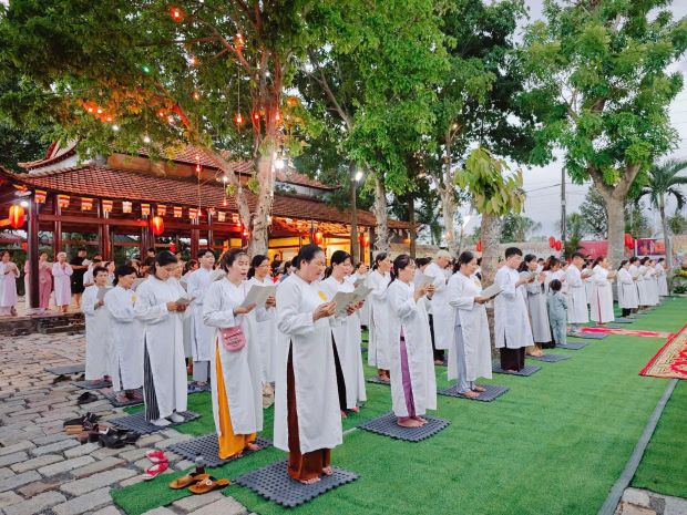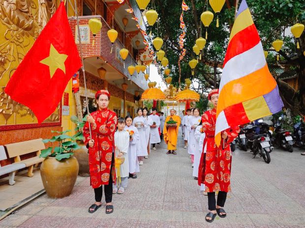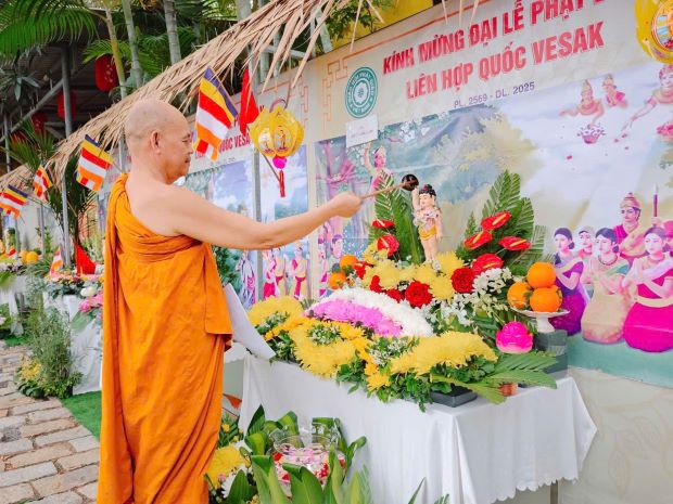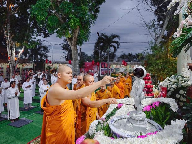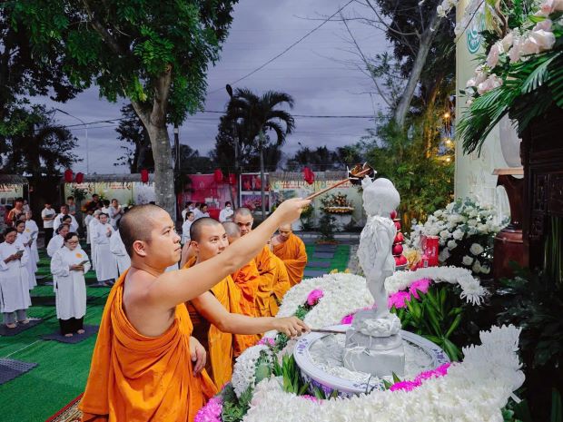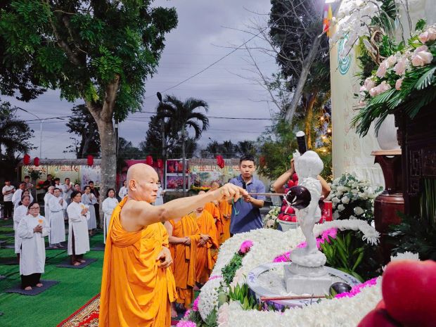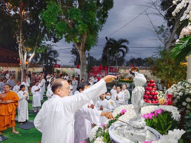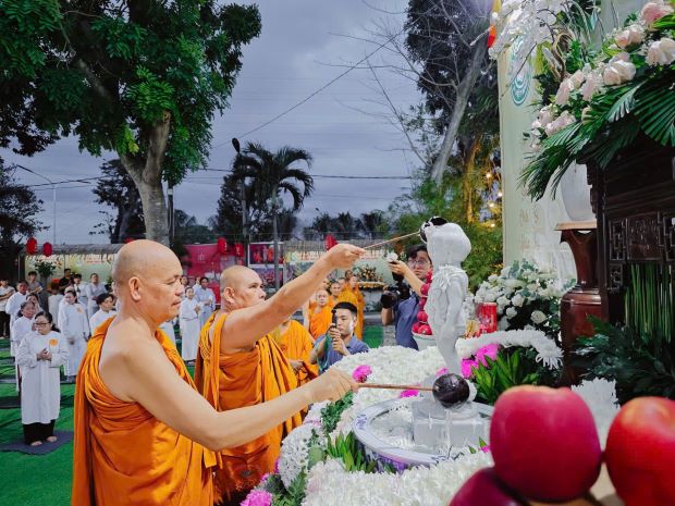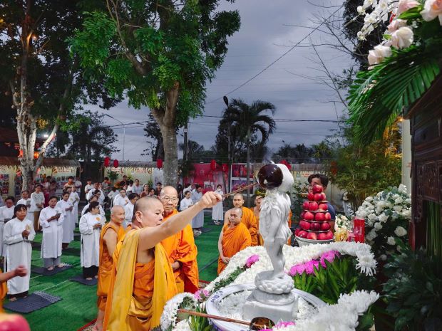 Khi tôn tượng được tôn trí trang nghiêm tại lễ đài, toàn thể đại chúng đồng thanh tụng thời kinh Khánh đản, hòa quyện trong hồi chuông trống Bát-nhã, tạo nên một không gian thiêng liêng cúng dường Đức Từ phụ Thích Ca Mâu Ni nhân ngày đản sanh của Ngài. Sau phần tuyên đọc Thông điệp Phật đản, dưới sự hướng dẫn của chư Tôn đức Tăng, hội chúng đã cùng thực hiện nghi thức tắm Phật – một pháp sự thiêng liêng mang ý nghĩa thanh tịnh thân tâm, gột rửa phiền não để trở về với bản tâm sáng trong.