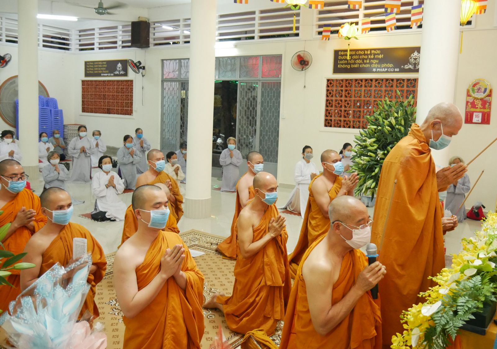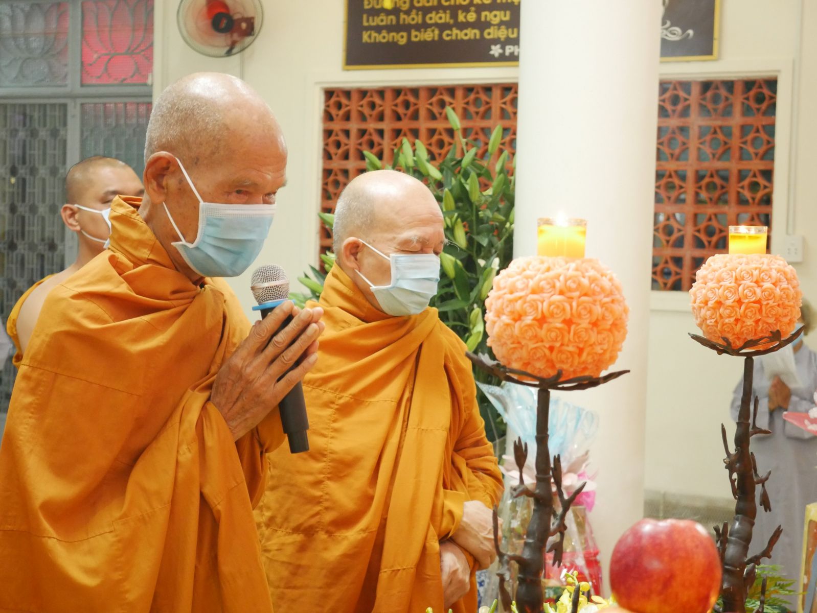 Sau nghi thức dâng hương, đảnh lễ Tam bảo, Trưởng lão Hòa thượng Chứng minh có đôi lời cầu nguyện và khuyến tấn Phật tử tinh tấn tu tập, thân tâm thường lạc trong ánh sáng của Đức Phật Dược Sư.